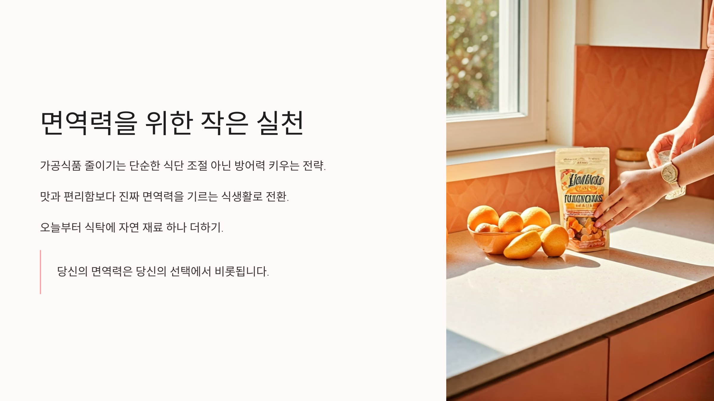 가공식품을 줄이는 것은 단순한 식단 조절이 아니라, 우리 몸을 위한 방어력을 키우는 전략입니다. 맛과 편리함을 좇는 습관에서 벗어나 진짜 면역력을 기르는 식생활로 전환하는 일은 작지만 강력한 변화입니다. 오늘부터 내 식탁 위에서 한 가지라도 자연의 재료를 더하는 실천을 시작해보세요. 당신의 면역력은 당신의 선택에서 비롯됩니다.