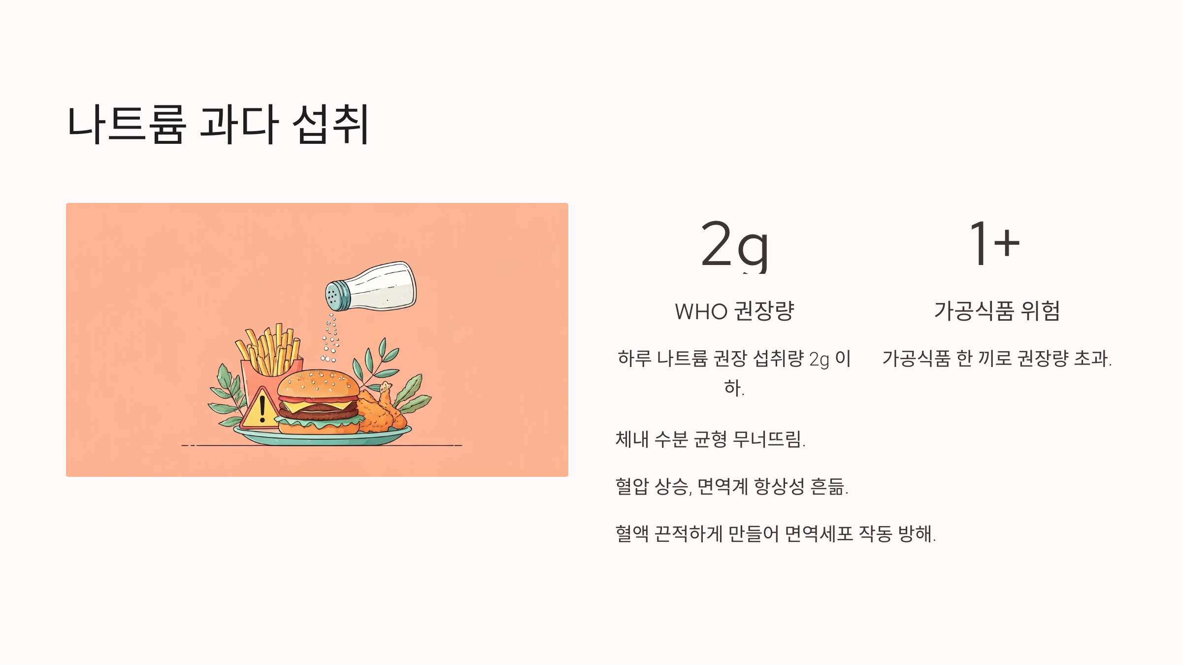 지나치게 높은 나트륨 함량은 체내 수분 균형을 무너뜨리고, 혈압을 상승시키며, 면역계의 항상성을 흔드는 요소가 됩니다. 짠 음식 위주의 식단은 혈액을 끈적하게 만들고, 세포 내외의 미세한 환경을 변화시켜 면역세포가 효율적으로 작동하기 어려운 조건을 만듭니다. WHO는 하루 권장 나트륨 섭취량을 2g 이하로 권고하고 있지만, 대부분의 가공식품 한 끼 섭취로 이 기준을 초과하는 경우가 많습니다.