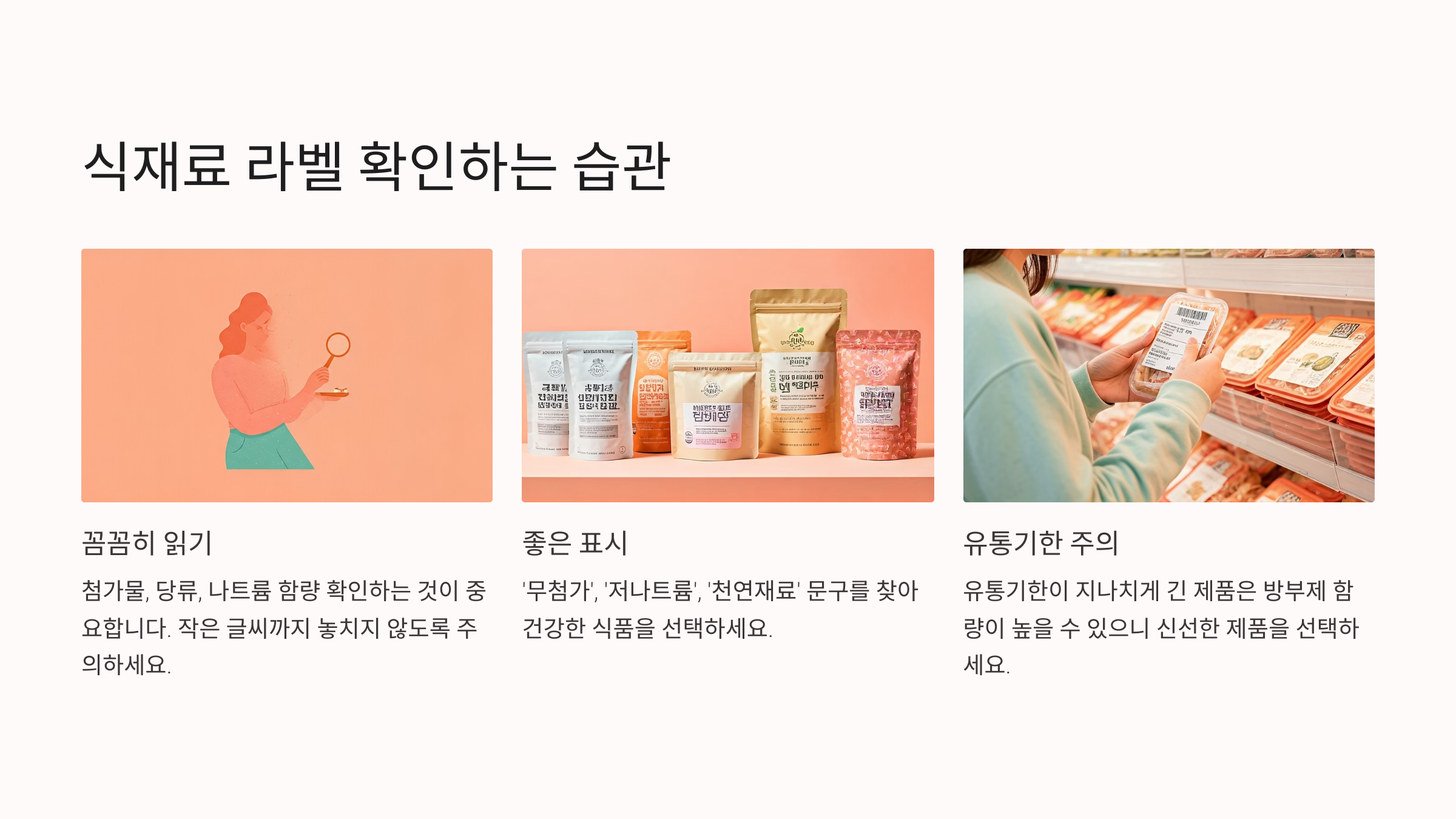 가공식품을 무조건 끊는 것이 현실적으로 어렵다면, 식재료 라벨을 꼼꼼히 읽고 첨가물과 당류, 나트륨 함량이 적은 것을 선택하는 것이 바람직합니다. 특히 '무첨가', '저나트륨', '천연재료 사용' 등의 문구가 있는 제품을 우선적으로 고르고, 유통기한이 긴 제품일수록 방부제 함량이 높을 수 있다는 점을 기억해야 합니다.