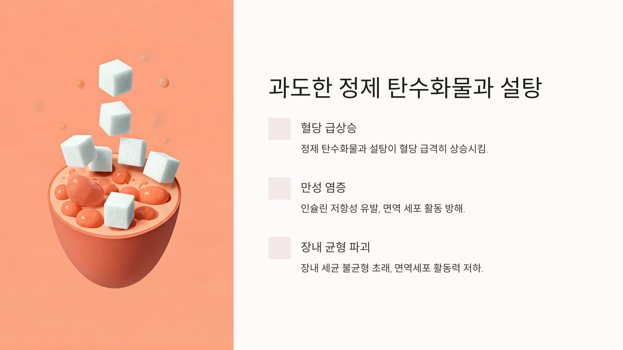 대부분의 가공식품은 정제된 탄수화물과 설탕이 과도하게 함유되어 혈당을 급격하게 상승시킵니다. 이는 인슐린 저항성을 유발하고 만성 염증을 촉진시켜 면역 세포의 활동을 방해합니다. 당의 과잉 섭취는 장내 세균의 불균형을 초래하고, 장 건강이 무너지면 면역의 핵심인 장내 면역세포의 활동력도 현저히 저하됩니다. 실제로 가공된 단 음식의 과다 섭취는 어린이부터 성인까지 면역력 저하와 직결되는 것으로 나타나고 있습니다.
