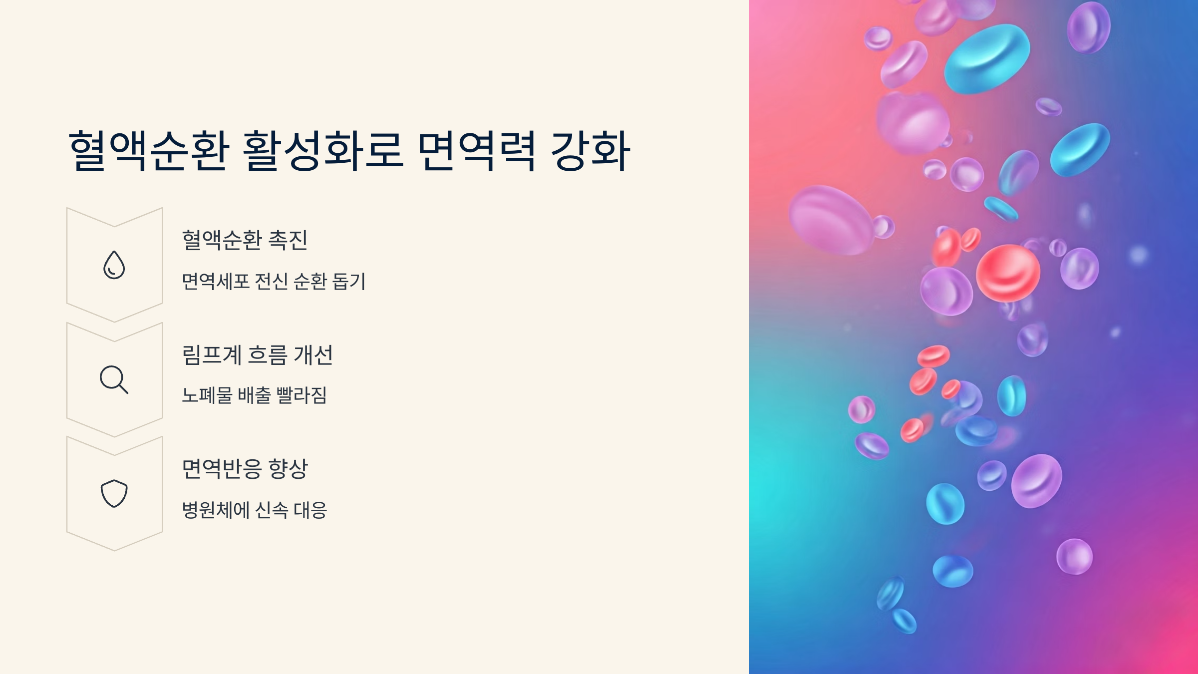규칙적인 걷기는 혈액순환을 원활하게 만들어 면역세포들이 전신을 순환하며 감염원을 탐지하고 제거하는 활동을 돕습니다. 특히 림프계의 흐름이 촉진되어 노폐물 배출이 빨라지고, 백혈구의 이동 능력도 강화됩니다. 이렇게 순환 기능이 좋아지면 면역체계가 외부 병원체에 신속하게 대응할 수 있게 됩니다. 단순히 다리를 움직이는 행위 같지만, 전신의 건강 시스템을 깨우는 효과가 있습니다.