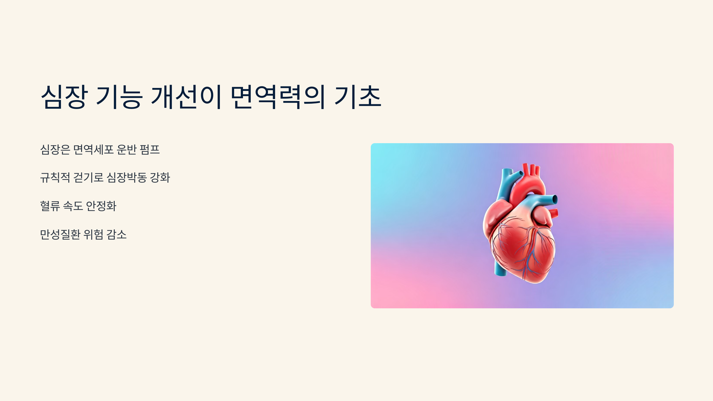 심장은 면역세포를 온몸으로 실어나르는 펌프 역할을 합니다. 걷기를 통해 심장박동이 규칙적으로 강화되면 혈류 속도가 안정되고, 조직 세포에 산소와 영양소 공급이 원활해집니다. 이는 면역세포가 보다 활발하게 움직일 수 있는 기반이 됩니다. 또한 꾸준한 걷기는 고혈압, 고지혈증, 당뇨 등 만성질환의 발병 위험을 줄이며, 이런 만성질환 자체가 면역력을 약화시키는 주요 요인이므로 간접적인 면역 강화 효과도 기대할 수 있습니다.