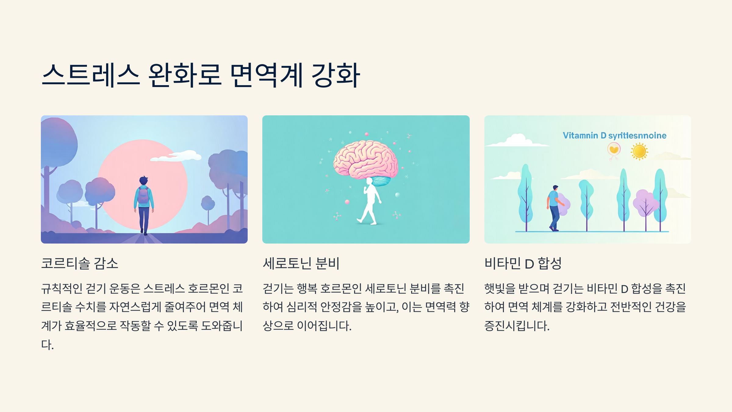 스트레스는 코르티솔이라는 호르몬을 분비시키며, 이 호르몬은 면역 기능을 억제합니다. 걷기를 통해 심리적 안정감을 얻고 뇌에서 세로토닌이 분비되면 스트레스가 자연스럽게 완화되고, 그로 인해 면역 체계가 제 기능을 발휘할 수 있습니다. 특히 자연을 보며 걷거나 햇빛을 쬐며 걷는 것은 비타민 D 합성을 촉진해 감염 저항력을 키우는 데도 도움이 됩니다.