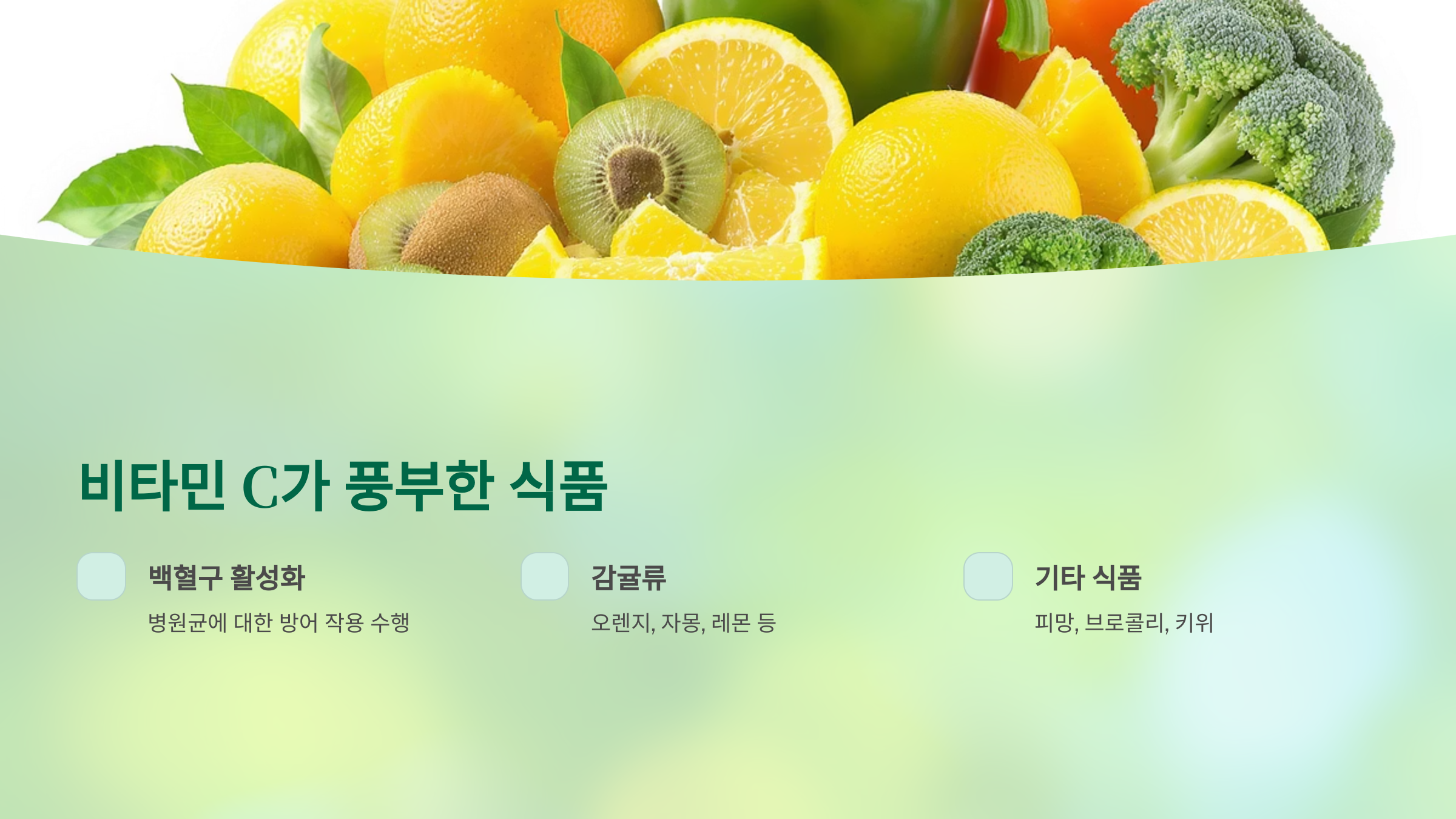 면역력을 이야기할 때 가장 먼저 떠오르는 것이 바로 비타민 C입니다. 이 영양소는 강력한 항산화제로 작용하며, 백혈구를 활성화시켜 병원균에 대한 방어 작용을 수행하는 데 중요한 역할을 합니다. 비타민 C가 풍부한 식품에는 오렌지, 자몽, 레몬 등의 감귤류뿐 아니라, 피망, 브로콜리, 키위 등이 있습니다. 이러한 식품들을 하루 한두 가지씩 식사에 포함하는 것만으로도 면역 기능을 자극하고 감염에 대한 저항력을 기를 수 있습니다.