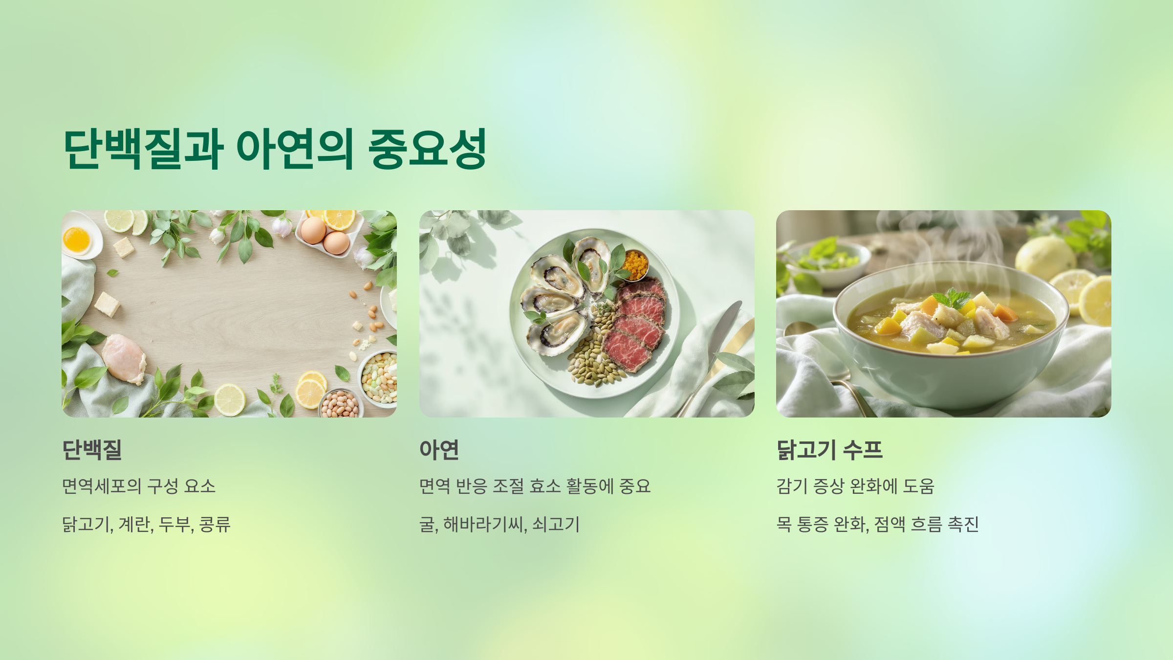 단백질은 면역세포의 구성 요소이며, 아연은 면역 반응을 조절하는 효소 활동에 중요한 미네랄입니다. 이 두 가지가 부족하면 우리 몸의 감염 저항력이 떨어지고 회복 속도도 늦어지게 됩니다. 닭고기, 계란, 두부, 콩류, 굴, 해바라기씨, 쇠고기 등은 이 두 영양소가 풍부한 대표 식품입니다. 특히 닭고기 수프는 목의 통증을 완화하고 점액 흐름을 도와 감기 증상 완화에 도움을 주는 음식으로 잘 알려져 있습니다.