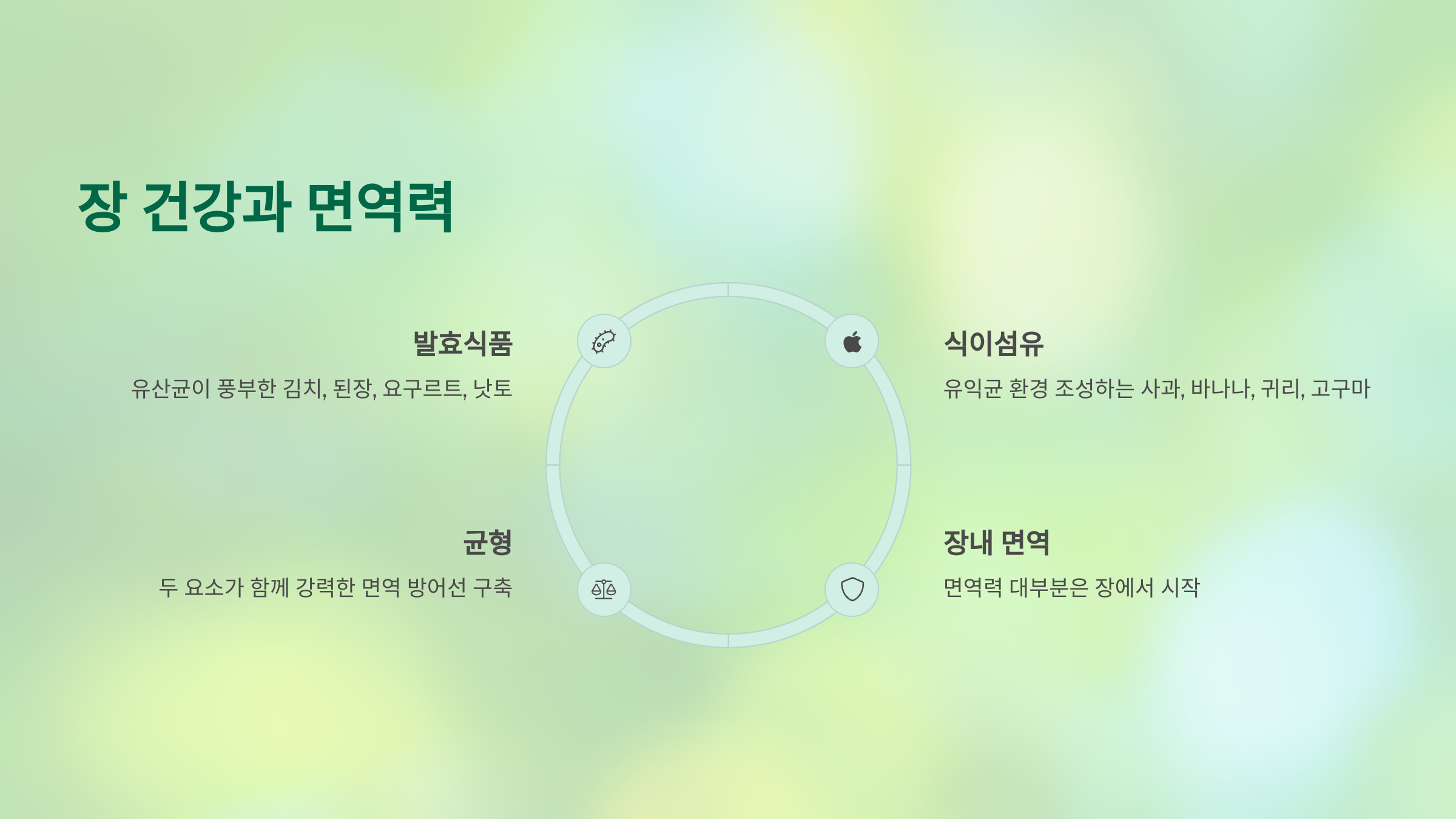 우리 몸의 면역력 대부분은 장에서 시작된다고 해도 과언이 아닙니다. 건강한 장내 미생물 환경은 면역세포의 기능을 활발하게 하고, 해로운 세균으로부터 우리 몸을 보호합니다. 김치, 된장, 요구르트, 낫토 등 발효식품은 유산균이 풍부하고, 사과, 바나나, 귀리, 고구마 등 식이섬유가 많은 식품은 유익균이 잘 자랄 수 있는 환경을 조성합니다. 이 두 요소가 함께 장내에서 강력한 면역 방어선을 구축하게 됩니다.