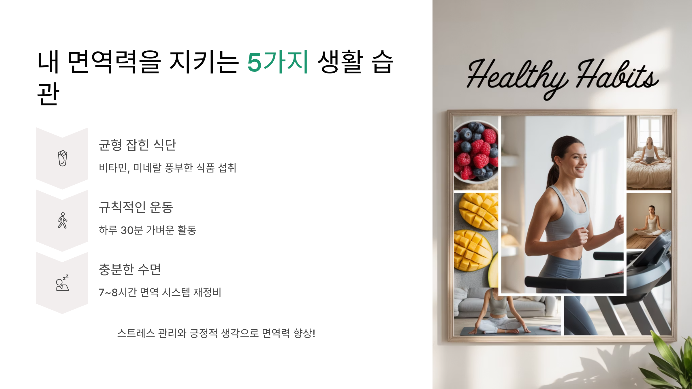 - 규칙적인 운동: 격렬하지 않아도 괜찮아요! 하루 30분 정도의 가벼운 걷기나 스트레칭만으로도 혈액 순환이 촉진되어 면역 세포가 활발해져요.