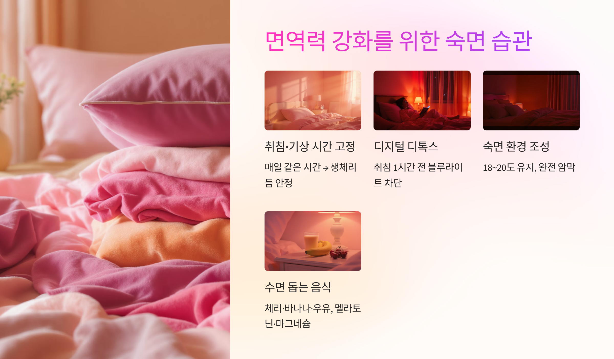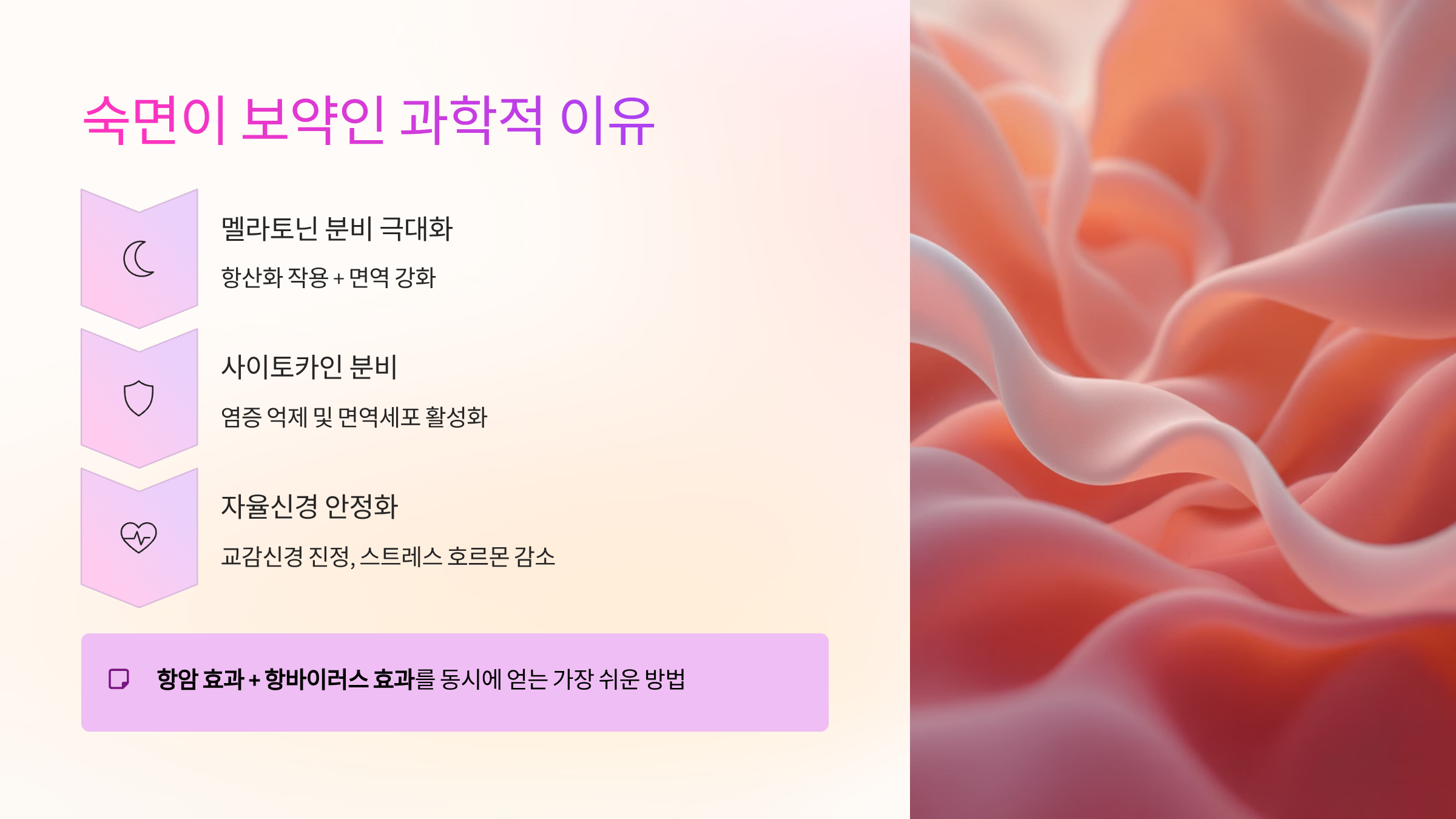 수면은 단순한 휴식이 아니라, 우리 몸이 면역 세포를 재충전하고 염증을 억제하는 시간입니다.