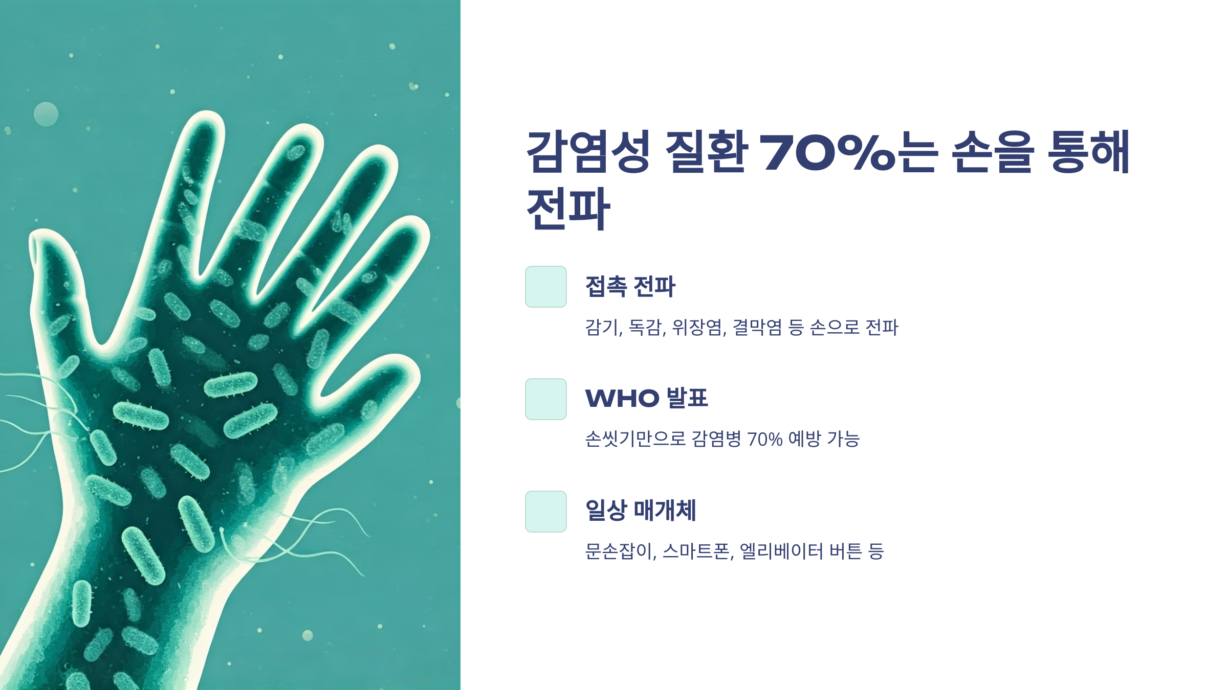 전염병의 대부분은 사람과 사람 사이의 접촉으로 전파됩니다. 감기, 독감, 위장염, 결막염, A형 간염 같은 질환은 바이러스나 세균이 손에 묻고, 이 손으로 눈, 코, 입을 만지면서 감염이 일어납니다. 실제 세계보건기구(WHO)는 “손씻기만으로 감염병 70%를 예방할 수 있다”고 밝힌 바 있습니다. 우리가 만지는 문손잡이, 스마트폰, 엘리베이터 버튼 등은 모두 바이러스와 세균이 존재할 수 있는 매개체이며, 그 손을 통해 우리 몸으로 침투하는 것이죠. 철저한 손씻기는 단순히 습관이 아니라, 면역의 방어막을 만드는 핵심 행동입니다.
