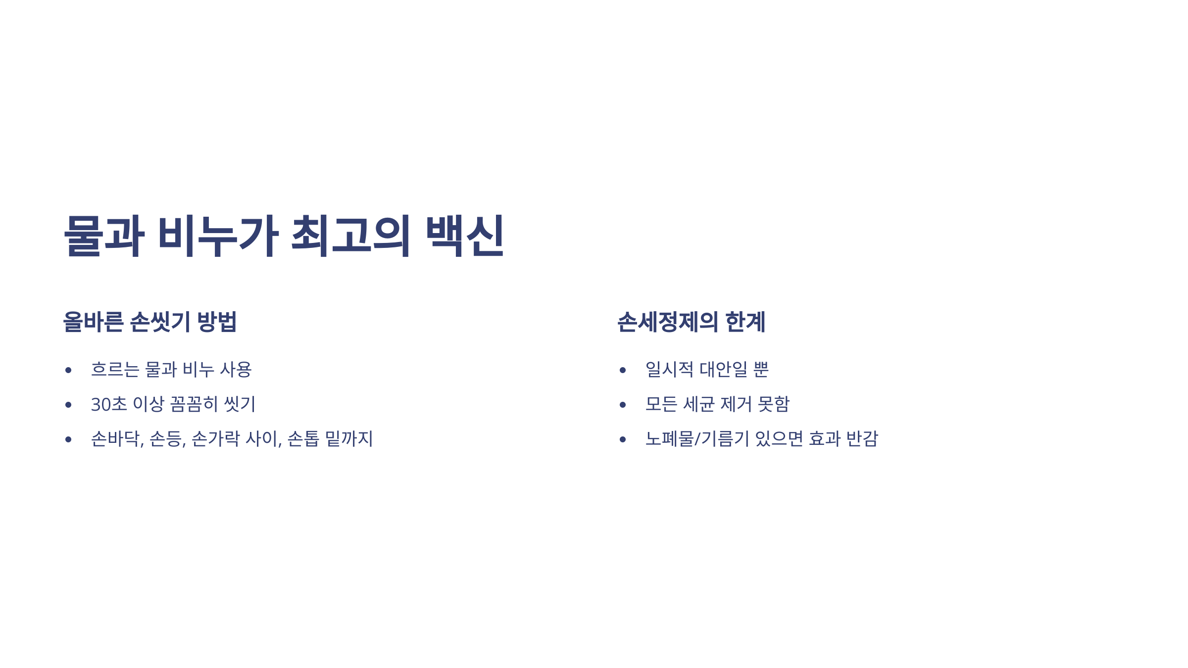 손세정제보다 물과 비누를 이용한 손씻기가 훨씬 효과적이라는 점을 아는 것이 중요합니다. 손세정제는 일시적인 대안일 뿐, 모든 세균을 제거하지 못할 수 있습니다. 특히 노폐물이나 기름기가 있는 상태에서는 세정제의 효과가 반감됩니다. 반면 흐르는 물과 비누를 이용해 30초 이상 손바닥, 손등, 손가락 사이, 손톱 밑까지 꼼꼼하게 씻으면 대부분의 병원균을 제거할 수 있습니다. 일명 ‘의학적 손씻기’가 바로 이 과정을 가리키며, 가장 기본이자 확실한 감염 예방법입니다.