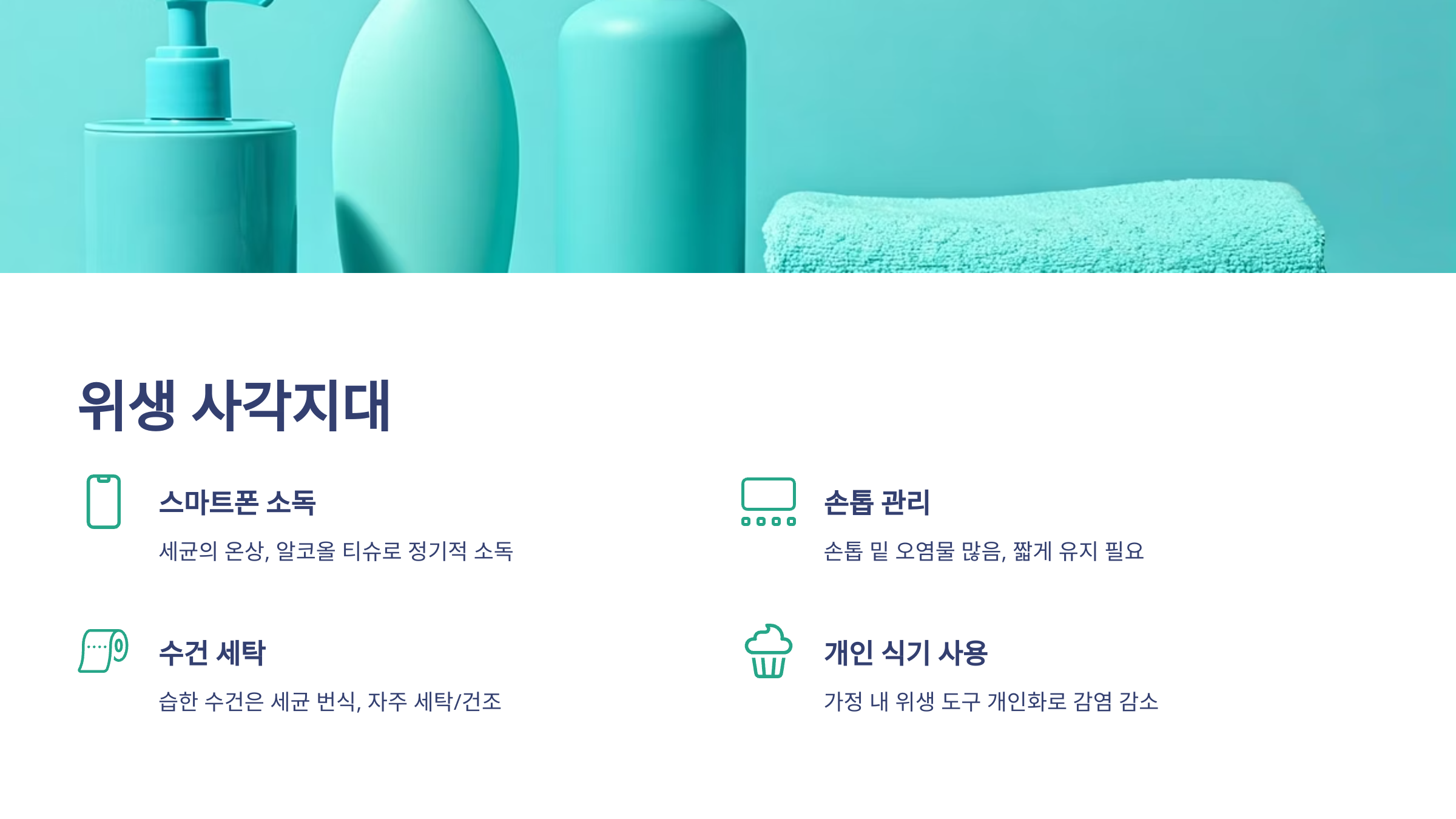 - 손톱 관리: 손톱 밑에는 보이지 않는 오염물이 많아 손씻기만으로는 부족할 수 있으므로 짧게 유지하는 것이 좋습니다.