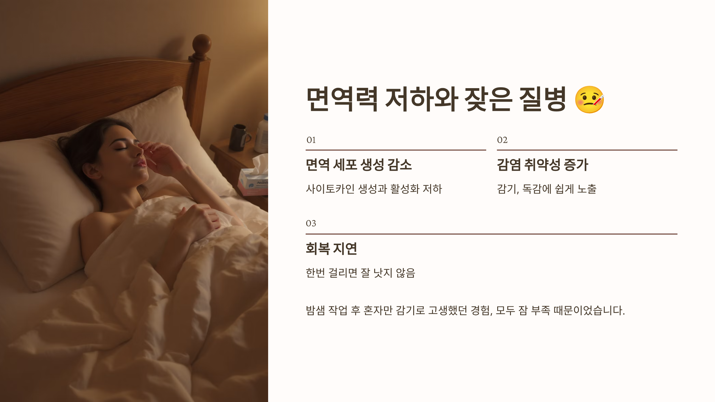 잠이 부족하면 이 중요한 면역 방어 체계가 약해져서, 감기 바이러스나 독감에 쉽게 노출되고 회복도 더뎌지게 돼요. 제가 예전에 밤샘 작업을 자주 했을 때, 동료들은 멀쩡한데 저 혼자 감기로 며칠씩 고생했던 기억이 납니다. 그때는 그저 운이 없다고 생각했는데, 지금 와서 보니 다 잠 때문이었던 거죠.