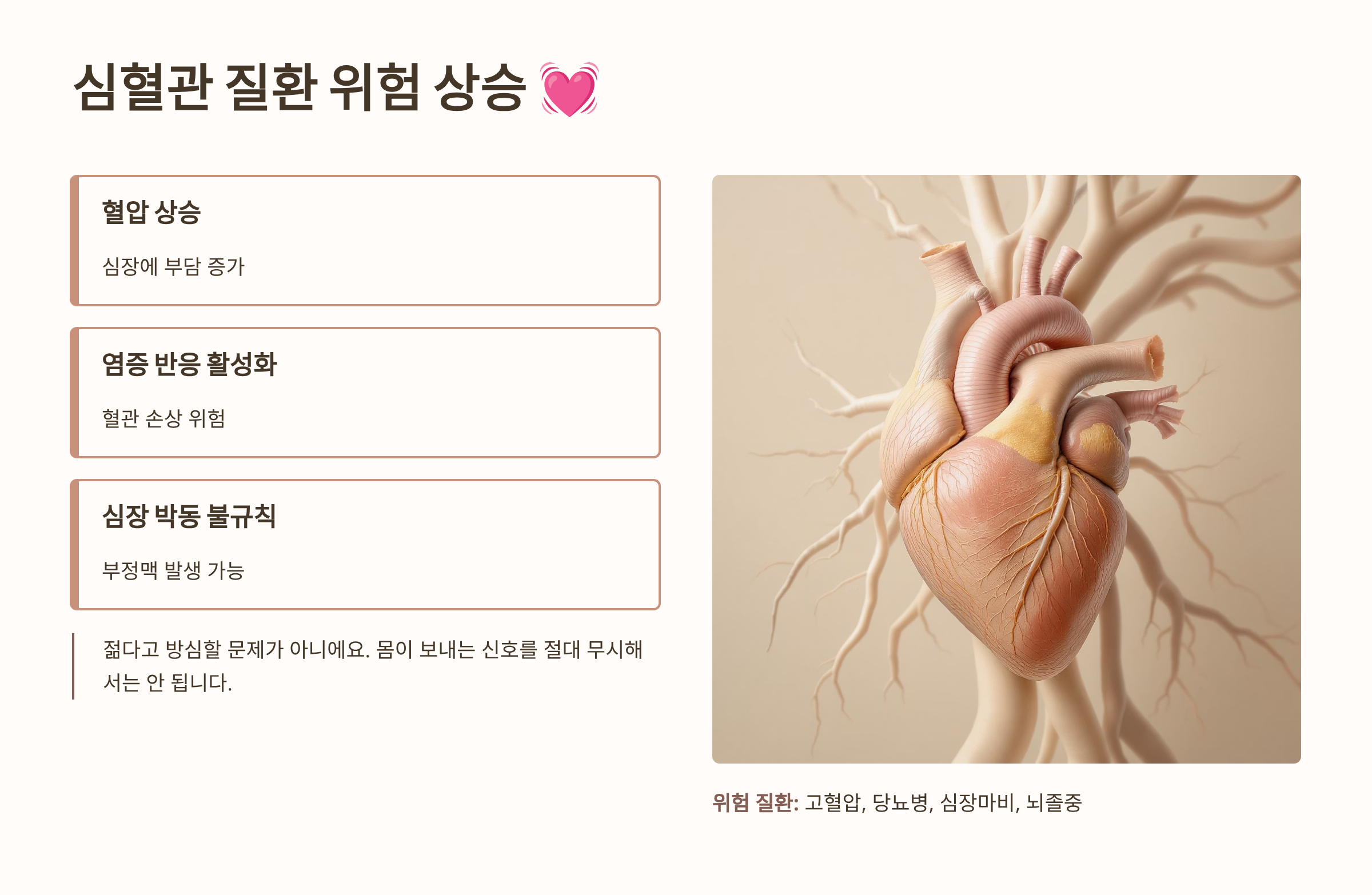 수면 부족은 우리 심장에도 큰 부담을 줍니다. 잠이 부족하면 혈압이 높아지고, 염증 반응이 활성화되며, 심장 박동에 불규칙성이 생길 수 있어요.