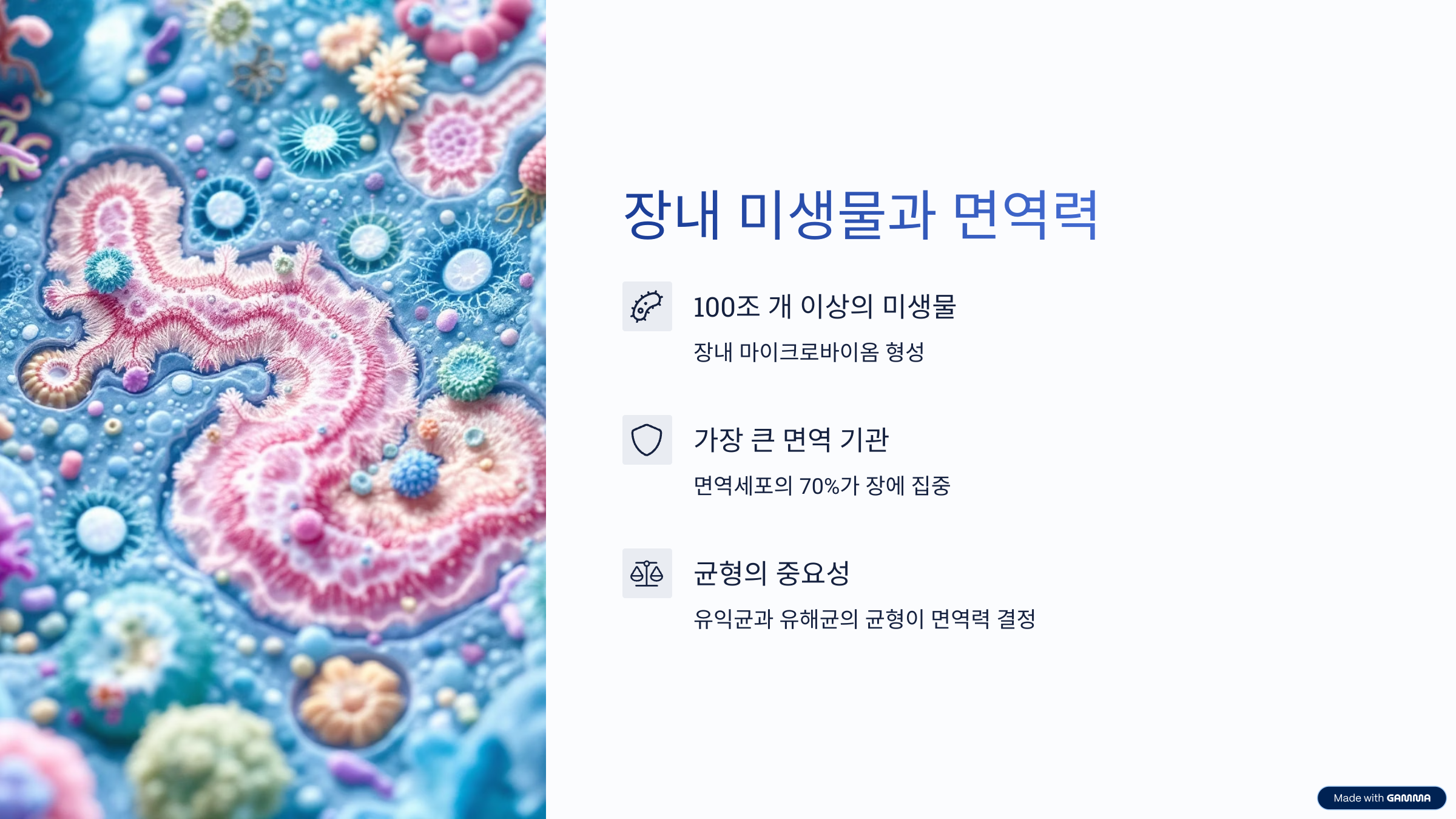 우리 장 속에는 약 100조 개 이상의 미생물이 살고 있으며, 이들이 바로 장내 미생물군(마이크로바이옴)을 형성합니다. 이 미생물들은 유익균(좋은 균)과 유해균(나쁜 균)으로 나뉘며, 이들의 균형이 깨지면 면역 체계는 제대로 작동하지 못하게 됩니다. 장은 우리 몸에서 가장 큰 면역 기관으로, 면역세포의 약 70%가 장에 집중되어 있습니다. 이 면역세포들은 장내 미생물의 정보를 분석하고, 우리 몸이 어떻게 반응할지를 결정합니다.
