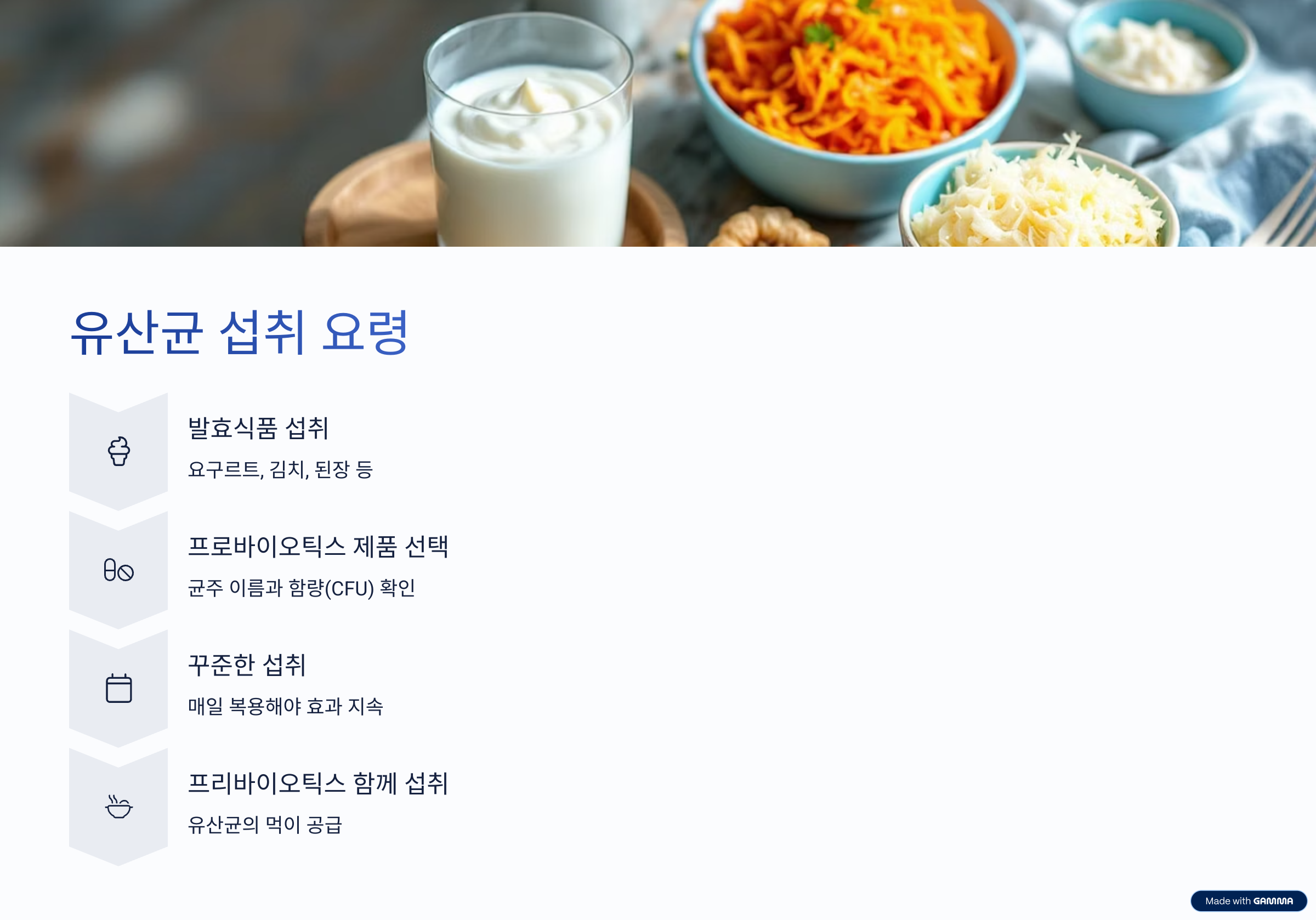 유산균은 발효식품(요구르트, 김치, 된장 등)을 통해 자연스럽게 섭취할 수도 있지만, 일정한 효과를 기대한다면 균주 이름과 함량(CFU)이 명확히 표시된 프로바이오틱스 제품을 선택하는 것이 좋습니다. 무엇보다 중요한 점은 매일 꾸준히 섭취해야 효과가 지속된다는 것입니다. 유산균은 장에서 오래 머물지 않기 때문에, 일시적으로만 복용하면 다시 유해균이 우세해질 수 있습니다.