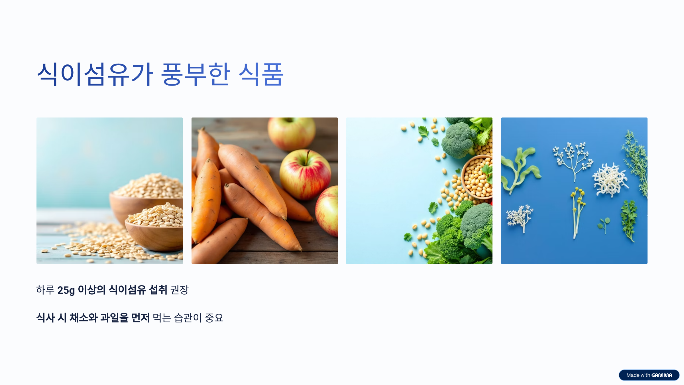 귀리, 보리, 고구마, 사과, 브로콜리, 콩류, 해조류 등은 식이섬유가 풍부한 식품으로, 유산균의 먹이가 되어 장내 유익균의 수를 늘려줍니다. 또한 식이섬유는 포만감을 주고 혈당을 안정시키며, 간접적으로 면역력 유지에도 기여합니다.