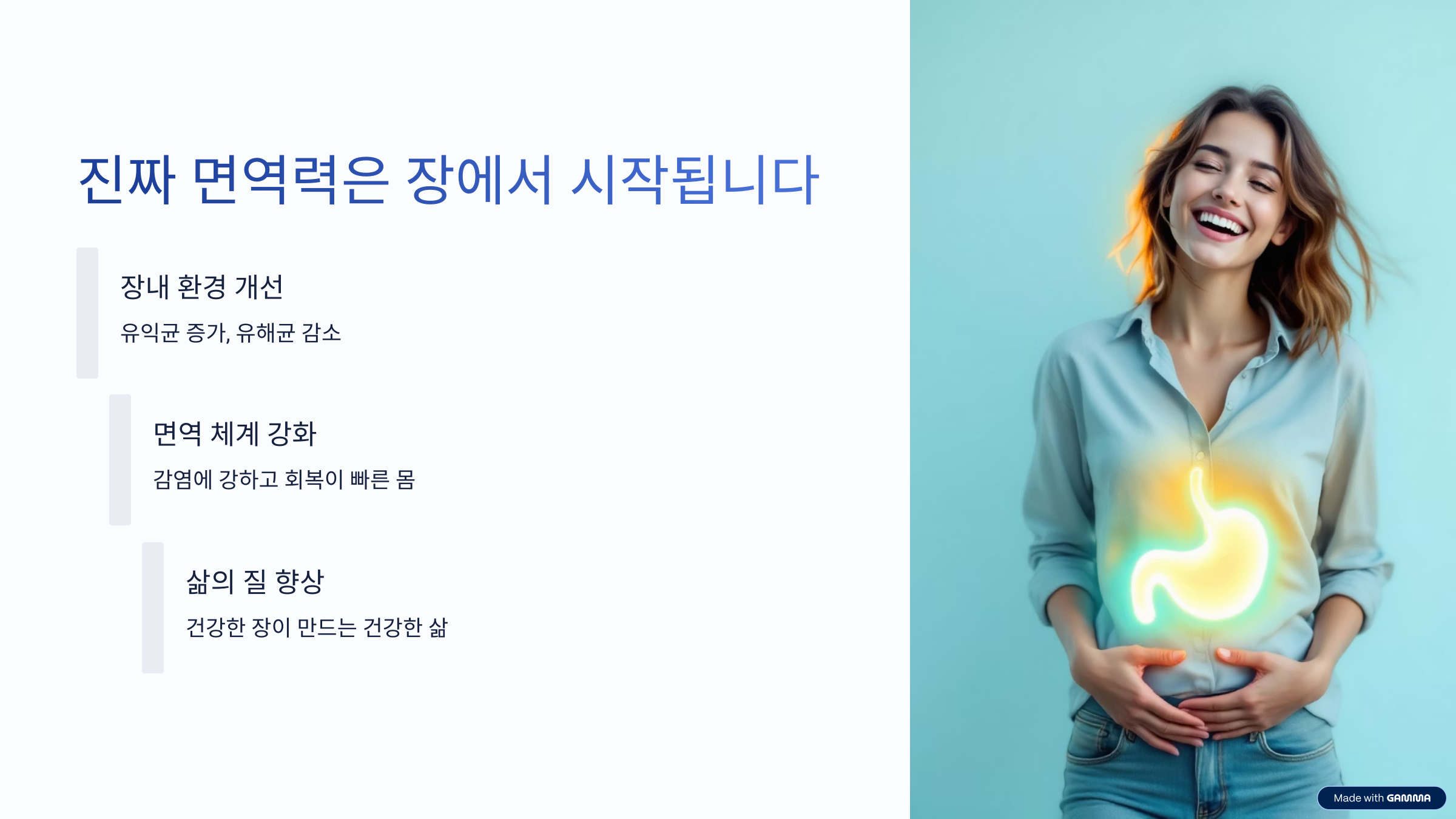 장 건강은 더 이상 소화 문제만의 영역이 아닙니다. 오늘날에는 장내 환경이 면역력의 핵심을 결정짓는 요소가 되었습니다. 유익균이 많고 식이섬유가 풍부한 장은 감염에 강하고, 회복이 빠른 몸을 만들어냅니다. 오늘 하루 식단에서 발효 식품을 추가하고, 군것질 대신 생과일을 선택해 보세요. 장이 바뀌면 면역이 달라지고, 면역이 달라지면 삶의 질이 근본부터 변화합니다. 진짜 면역력은 장에서 시작됩니다.