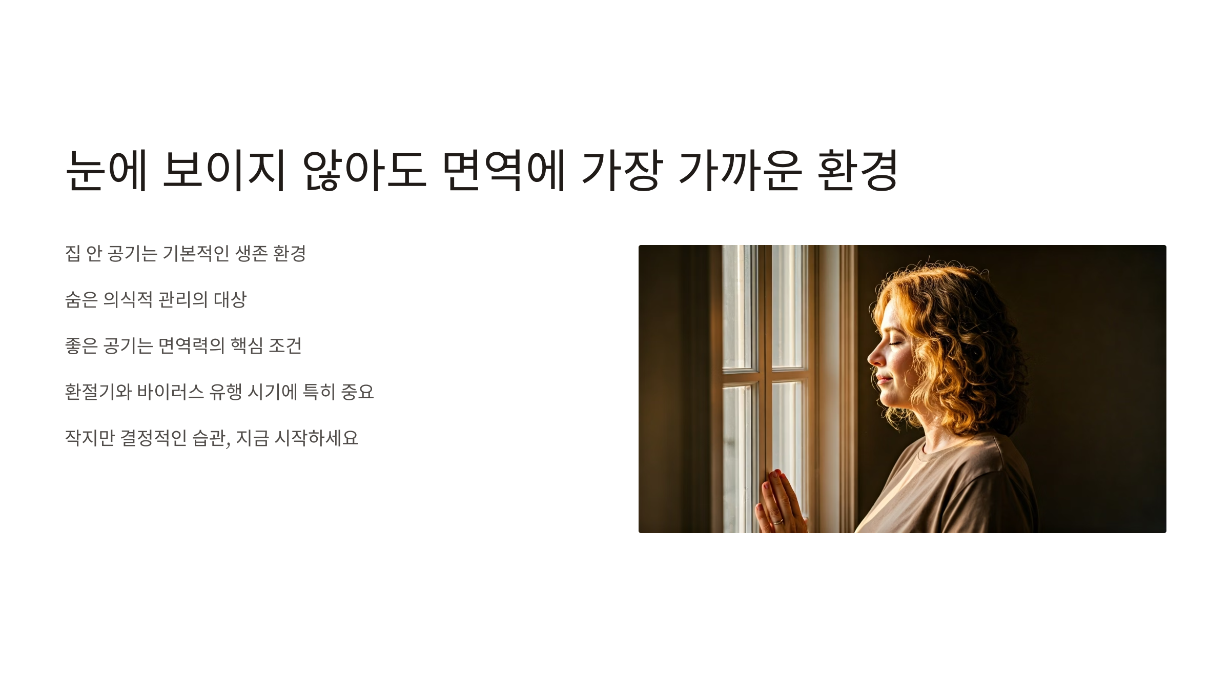 집 안 공기는 우리가 숨쉬며 살아가는 가장 기본적인 환경입니다. 숨은 자동이 아니라 의식적인 관리의 대상입니다. 좋은 공기는 단순한 쾌적함을 넘어서, 면역력을 키우는 핵심 조건입니다. 특히 면역력이 약해지는 환절기나 바이러스 유행 시기에는 환기와 공기 관리가 그 어느 때보다 중요합니다. 오늘 당신의 창문을 활짝 열어보십시오. 바람이 스치고 지나간 자리에는 건강한 면역력이 남을 것입니다. 단순한 환기가 건강의 방향을 바꿀 수 있습니다. 작지만 결정적인 이 습관, 지금 시작해 보십시오.