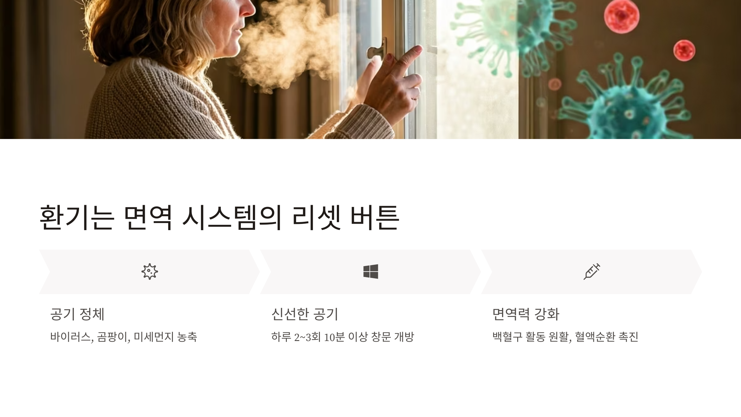 하루 24시간 중 대부분을 실내에서 보내는 현대인에게 ‘공기’는 피부처럼 밀착된 환경 요소입니다. 그러나 우리는 물 한 잔에는 신경 쓰면서도, 하루 수만 번 들이마시는 공기에 대해서는 얼마나 민감하게 반응하고 있을까요? 특히 면역력을 유지하고 질병을 예방하기 위해 가장 먼저 점검해야 할 것이 바로 ‘집 안 공기’입니다. 공기질이 나빠지면 우리 몸의 면역 방어선이 가장 먼저 무너집니다. 알레르기, 천식, 피부염, 만성 피로 등의 질환이 실내 공기와 깊은 관련이 있다는 연구가 이를 뒷받침합니다. 이 글에서는 환기가 왜 면역력에 직접적인 영향을 주는지, 어떤 공기 관리 습관이 건강한 면역을 지켜주는지 구체적으로 살펴봅니다.