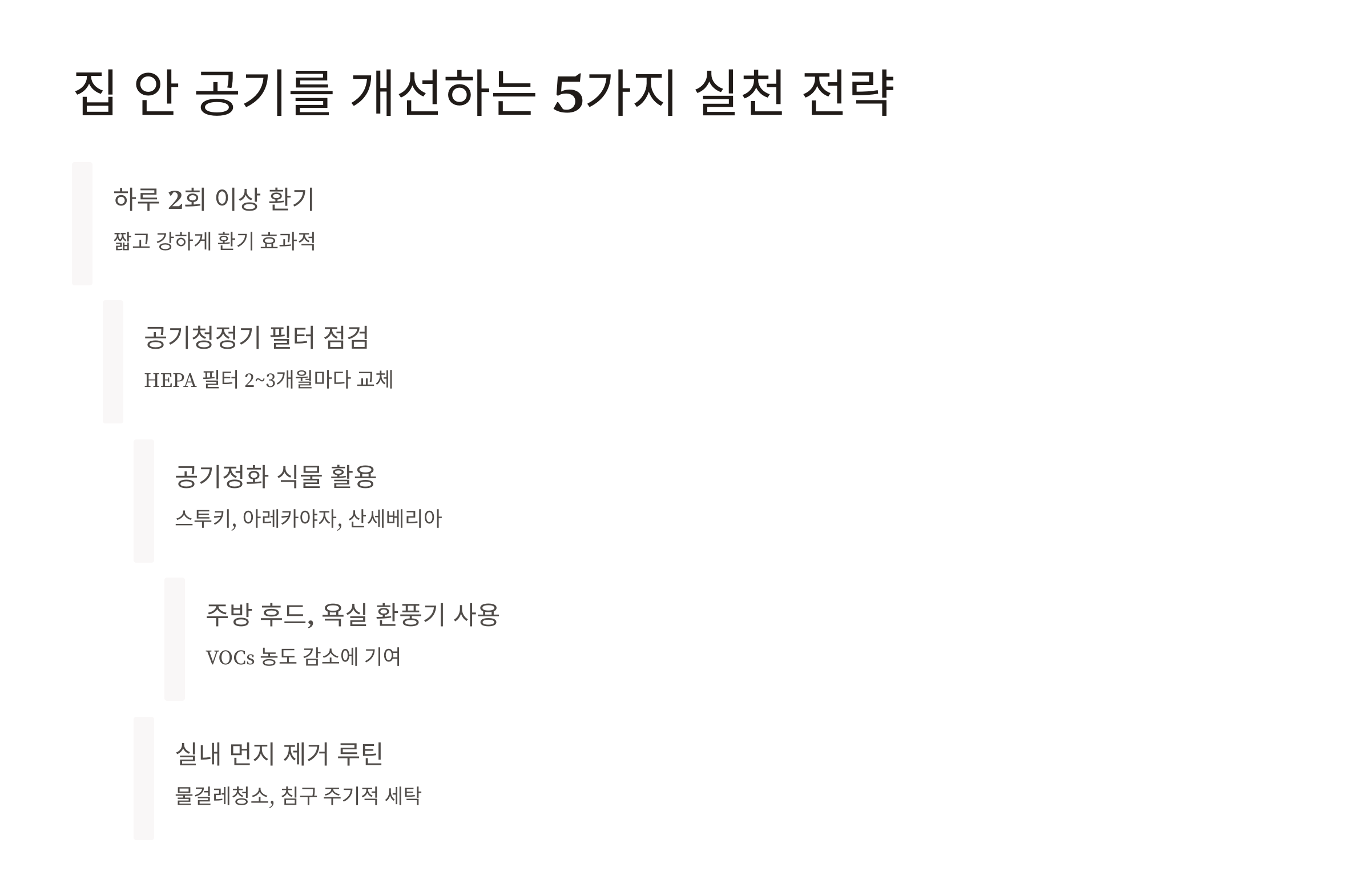 - 주방 후드와 욕실 환풍기 사용 습관화 – 일상적인 사용만으로도 휘발성 유기화합물(VOCs)의 농도를 낮추는 데 기여합니다.