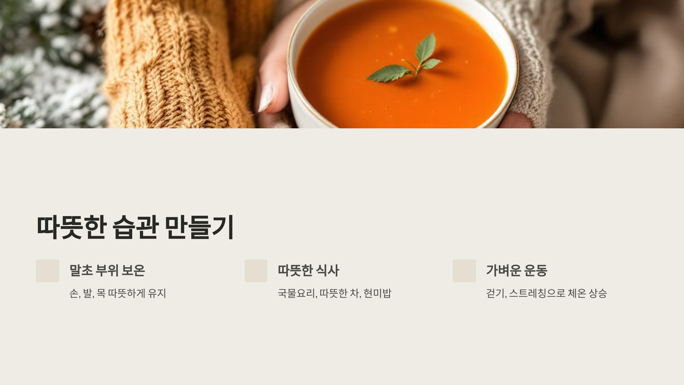 그렇다면 건강하게 체온을 유지하려면 어떻게 해야 할까요? 가장 먼저 손, 발, 목과 같은 말초 부위에 주목해야 합니다. 이 부위들은 체온이 가장 먼저 떨어지는 곳으로, 보온 상태가 전체 체온에 영향을 미칩니다. 핫팩을 사용하거나, 따뜻한 물에 몸을 담그고, 옷을 여러 겹으로 입고, 두꺼운 양말로 발을 감싸는 습관은 체온 유지를 돕습니다. 또한 국물요리, 따뜻한 차, 현미밥 등 따뜻한 식사는 소화를 촉진하고 혈액순환을 돕습니다. 가벼운 걷기 운동이나 스트레칭도 몸 안의 열을 발생시켜 면역력 상승에 기여합니다. 이처럼 일상 속에서 실천할 수 있는 작은 습관들이 쌓이면 면역에 강한 체질로 바뀔 수 있습니다.