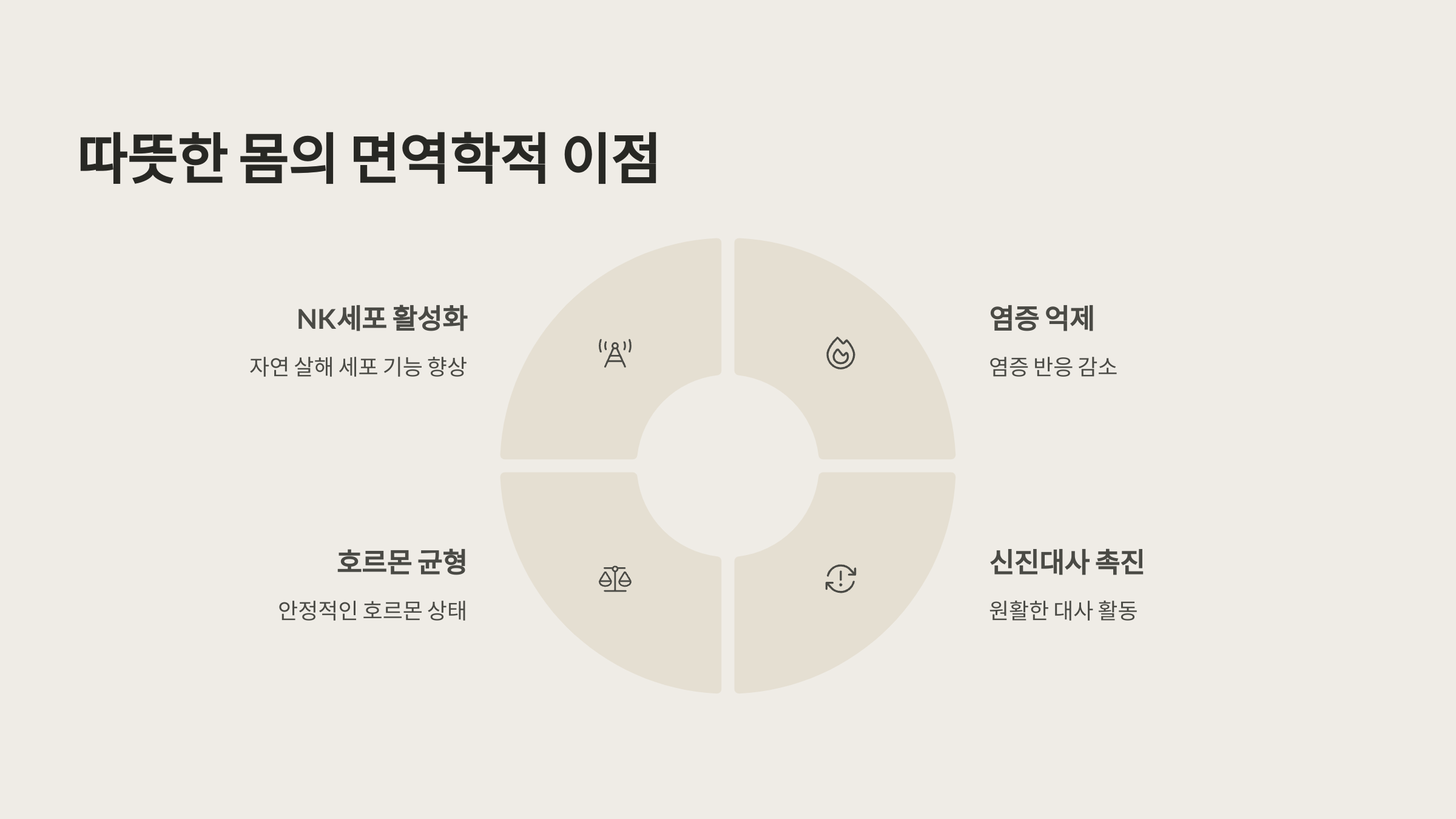 면역 시스템은 따뜻한 환경에서 가장 활발히 작동합니다. 체온이 안정적으로 유지되면 NK세포(자연 살해 세포)가 활성화되고 염증은 억제되며 신진대사도 매끄럽게 이루어집니다. 반대로 만성적인 추위에 노출되면 피로감, 호르몬 불균형, 면역력 저하 등이 뒤따를 수 있습니다. 특히 냉방이 심한 곳에서 근무하거나 장시간 앉아 있는 생활을 하는 사람들은 움직임 부족으로 인해 체온이 쉽게 떨어지게 됩니다. 따라서 실내 온도를 따뜻하게 유지하고, 겨울철에는 찬 음료 대신 따뜻한 물을 마시는 등의 세심한 관리가 필요합니다.