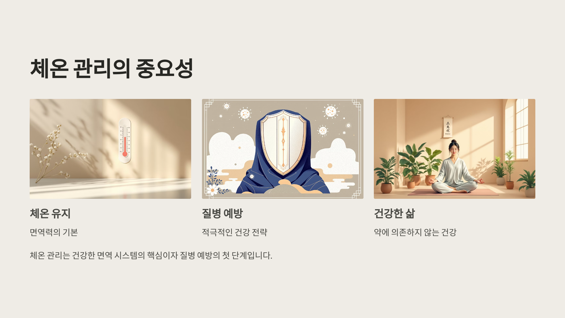 따뜻하게 지내는 습관은 단순한 위안이 아닌 질병을 예방하는 적극적인 전략입니다. 몸이 얼마나 잘 싸울 수 있는지는 그 내부 환경에 달려 있습니다. 따뜻하고 안정된 체온은 면역력을 자연스럽게 끌어올리고, 약이나 영양제에 의존하지 않고도 건강을 지킬 수 있게 해줍니다. 오늘부터 스스로를 따뜻하게 감싸는 작은 실천을 시작해보십시오. 단 몇 도의 차이가 여러분 몸의 저항력을 결정짓는 큰 힘이 될 수 있습니다.