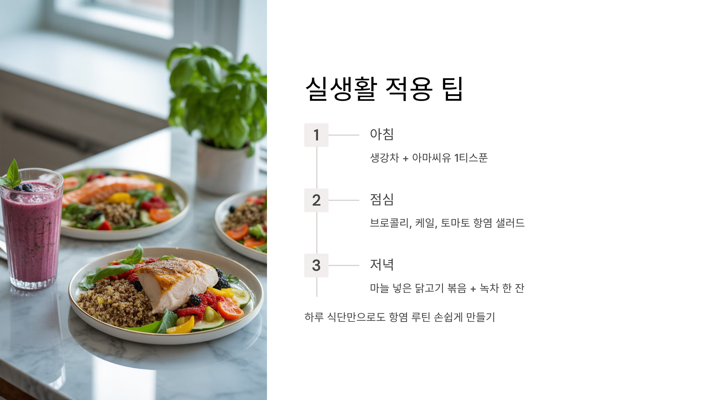 이렇게 하루 식단만으로도 항염 루틴을 손쉽게 만들 수 있습니다.