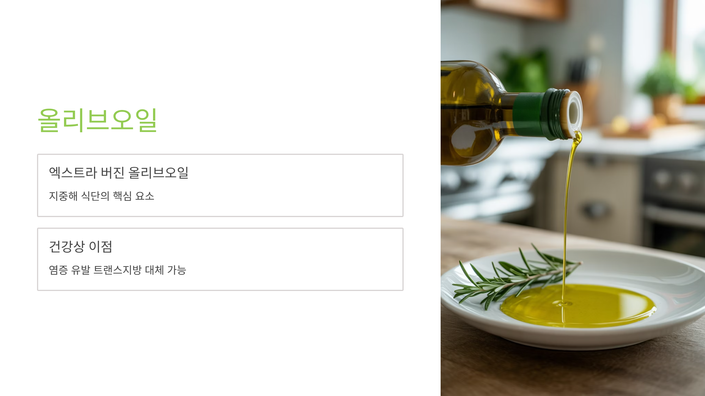 엑스트라 버진 올리브오일은 지중해 식단의 핵심이며, 염증을 유발하는 트랜스지방을 대체할 수 있습니다.